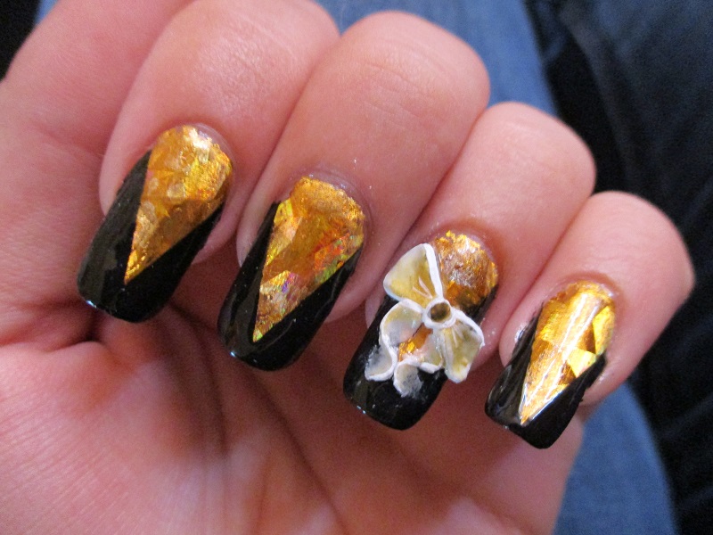 Pour ce qui est du nail art, j'ai fais assez simple. Sur tous les ongles j'ai mis de la colle à foil, puis j'ai posé un foil doré avec des reflets holographiques, que j'ai acheté sur la boutique ChezDelaney.com.